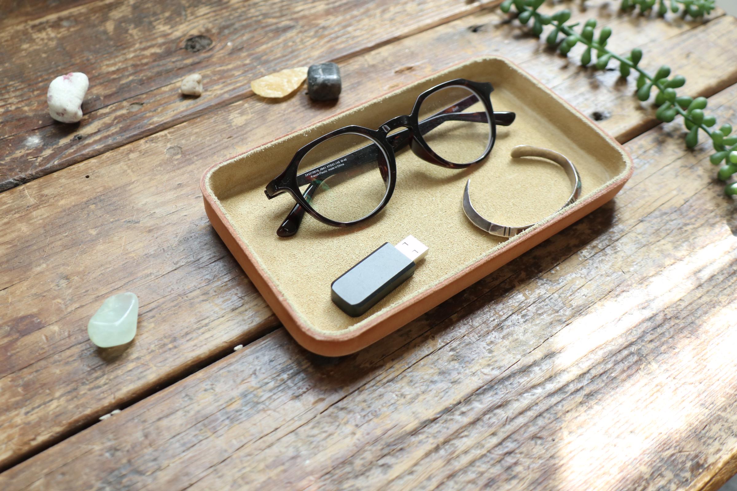 Sturdy and thick natural vegetable tanned leather and garment suede leather are combined into an elegant finish for the leather tray. A seamless and simple finish is unassuming at a glance, yet special techniques are utilized over long periods of time and with much care.